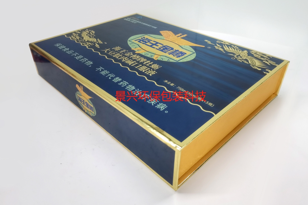 1.材質(zhì)選擇:選擇高質(zhì)量的材料,如紙張、硬盒等,以確保禮盒的外觀和手感與高檔相符,如景興給海王生物做的包裝盒,采用金卡紙張印刷的,拿在手上都給人一種昂貴的心理暗示。